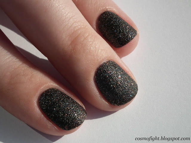 Czarna baza a w niej miliony iskrzących się błękitnych, pomarańczowych, srebrnych, fioletowych i różowych drobinek. Na żywo robi cudowne wrażenie. CENA: 7,69 PLN.